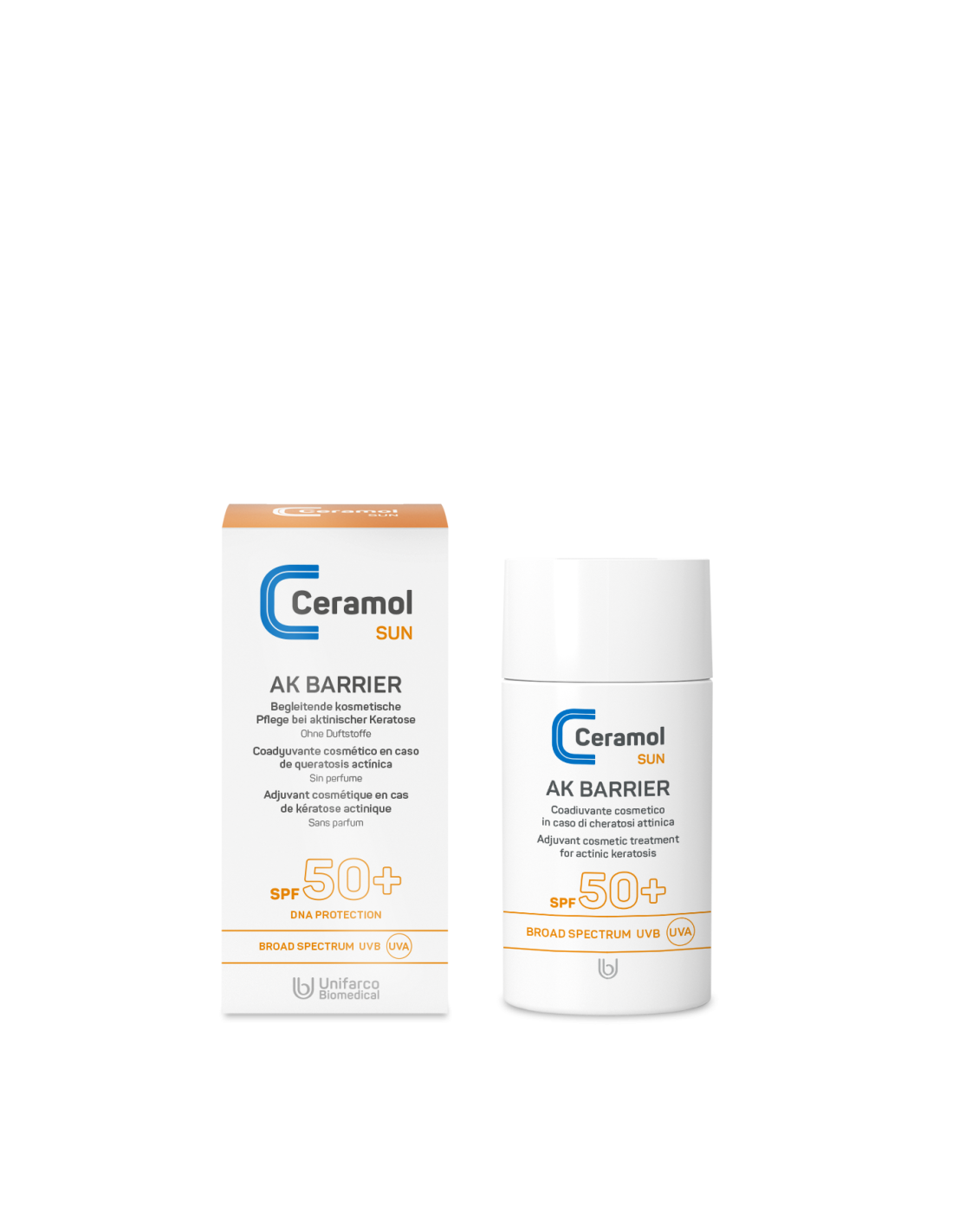 Fluido con acción protectora y preventiva de los daños asociados a una fotoexposición prolongada. Coadyuvante cosmético en caso de queratosis actínica. AK Barrier ofrece una triple barrera de protección: antioxidante, lipídica y fisicoquímica, potenciando los mecanismos de defensa de la piel. Es un fluido emoliente y protector muy ligero, no deja residuos blancos.